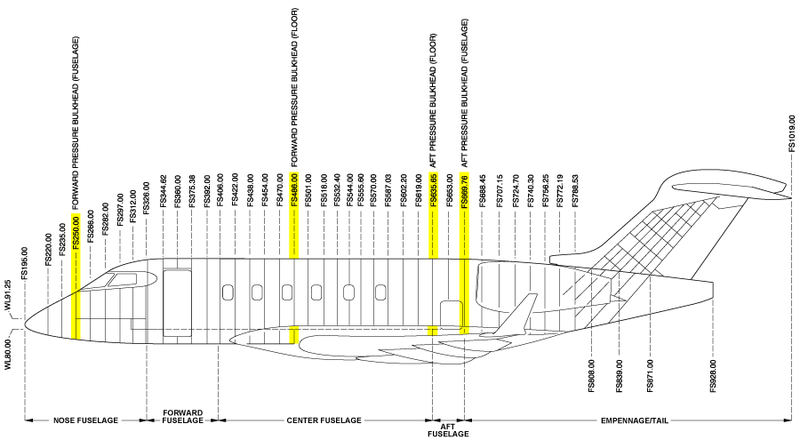 The Fuselage Stations (FS) are measured along the longitudinal axis of the aircraft and are reference planes found at right angles to the fuselage center line. The primary FS datum line (FS0.00, not shown) is 195.00 inches forward of the aircraft nose (FS195.00). The aircraft is divided into the primary fuselage areas that follow: