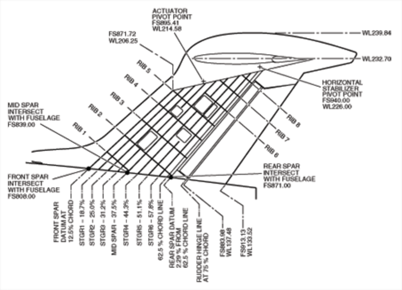The vertical stabilizer ribs also have references to the percentage (%) of chord line. The 0% chord point is the point at the leading edge of the vertical stabilizer where a vertical line intersects with the fuselage. The 100% chord point is the point at the trailing edge of the rudder where a vertical line intersects with the fuselage. The percentage of chord numbers shown in the figure are related to the range between the 0% chord and 100% chord points.