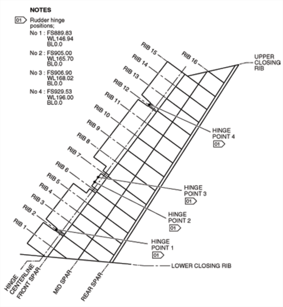 For the rudder, the ribs are found at right angles to the rear spar. The rudder spar center line is parallel to the rear spar of the vertical stabilizer. The rudder has four hinge positions.