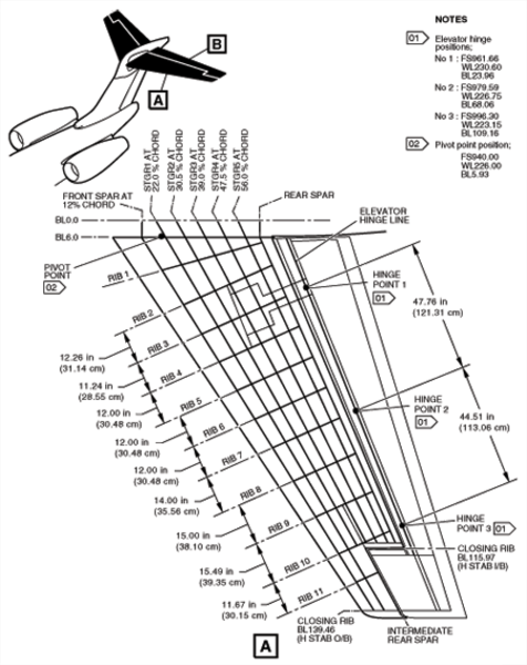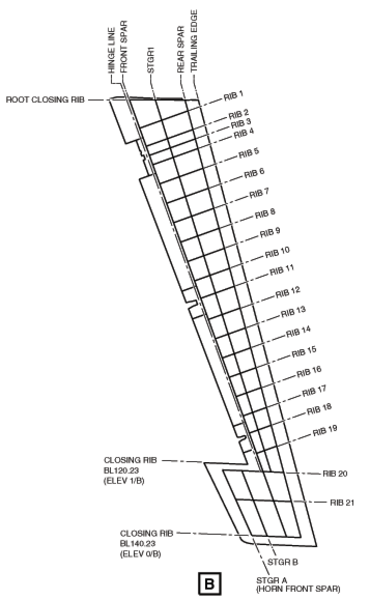 For the elevator, ribs 1 to 19 are found at right angles to the front spar. Ribs 20 and 21 intersect the horn front spar at an angle other than the right angle. The elevator hinge line is parallel to the front spar of the elevator. The elevator has three hinge positions.