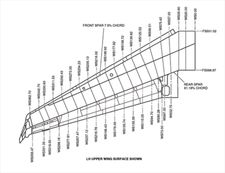 The wing stations (WS) are measured along the lateral axis of the aircraft. The WGLTS abbreviation is used to identify winglet stations.