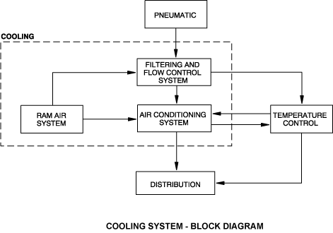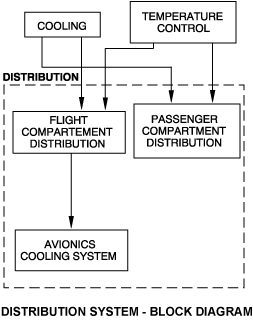 The distribution system includes the distribution ducts that go from the aft pressure bulkhead to the flight compartment and to the passenger compartment. Hot and cold air are mixed to control the flight and passenger compartment ambient temperatures. The temperature control system supplies hot air to the distribution system. The cooling system supplies conditioned air to the distribution system. An exhaust system does the cooling of the equipment racks and adaptive flight-display units. The fresh air supplied to the flight and passenger compartments is removed overboard by the pressurization control system.