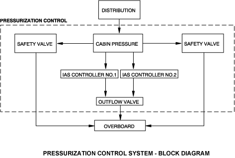 The pressurization control system keeps the correct pressure in the flight compartment, the passenger compartment, and the baggage compartment. Two integrated air system (IAS) controllers automatically control and monitor the system. Fresh air from the distribution system is used to pressurize the aircraft. An outflow valve adjusts the aircraft differential pressure. If the primary cabin-pressure control system (CPCS) does not operate, two safety valves prevent too much positive or negative differential pressure.