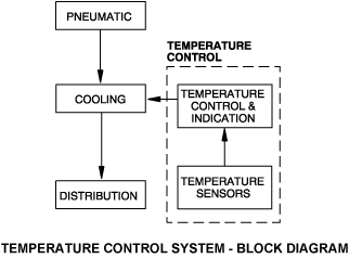 The temperature control system adds hot air to the conditioned air supplied by the cooling system. The quantity of hot air added to the conditioned air is dependent on the aircrew selection. The hot and conditioned air is then supplied to the pressurized areas of the aircraft by the distribution system.