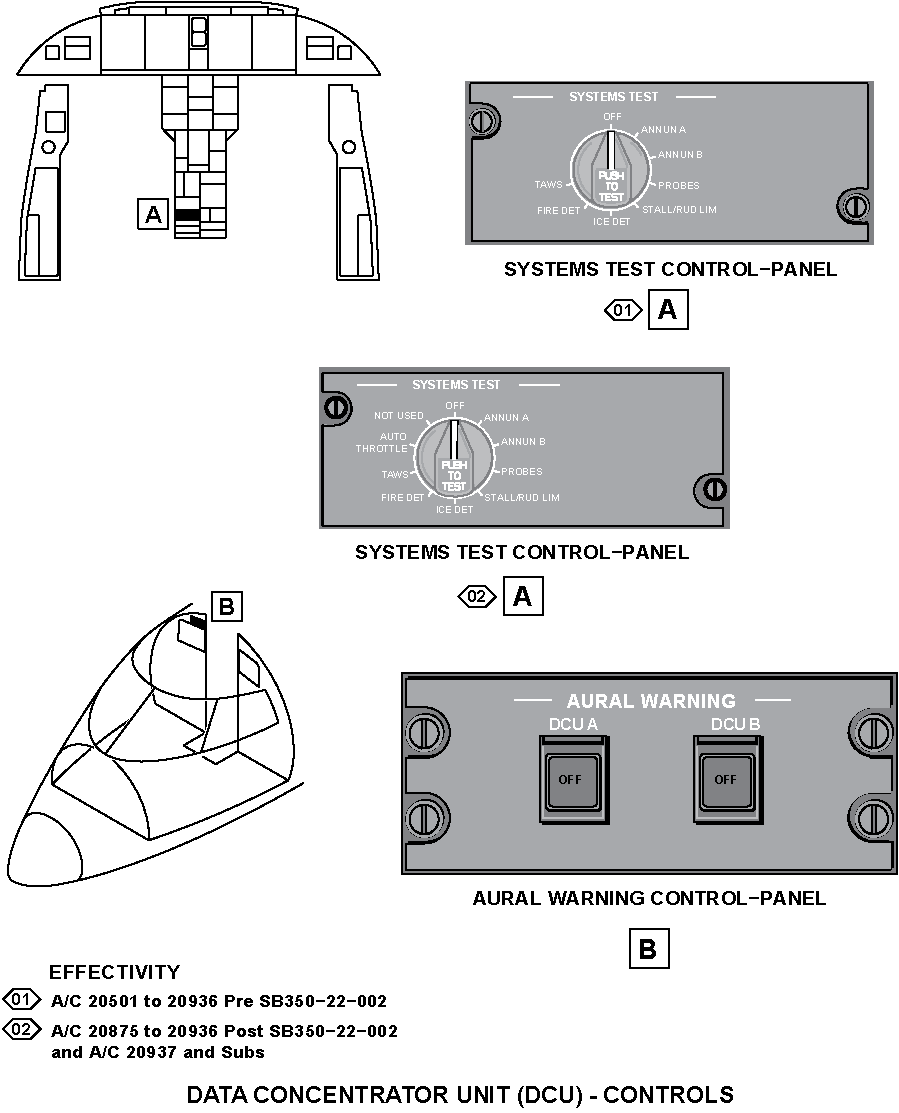 On the SYSTEMS TEST control-panel, the flight crew can do the test of the aural warning function. The test is for each DCU channel and its related same side RIU channel. The ANNUN A button and the ANNUN B button start the test of each channel function when pushed and held for a predetermined time. The aural warnings, other than for traffic alert and collision-avoidance system (TCAS) and terrain-avoidance warning system (TAWS) (which do not go to the DCU), occur in sequence. When the TCAS and TAWS related warnings occur, they override the aural warning that may be in operation at that time, but not the STALL aural warning. The STALL warning overrides all aural warnings.
