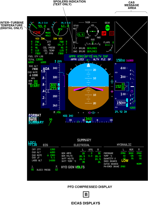 The engine and aircraft systems data, and the CAS messages, show as a full EICAS display on the top half of an multi-function display (MFD). They can also show as a compressed EICAS display on the top half of the primary flight displays (PFDs) or MFDs. The synoptic pages show on the bottom half of an MFD. The summary page shows on the top half of the right MFD or on the bottom half of the PFDs or MFDs. If the left MFD fails, the engine indicating system (EIS) display automatically shows on the right MFD.