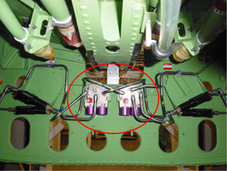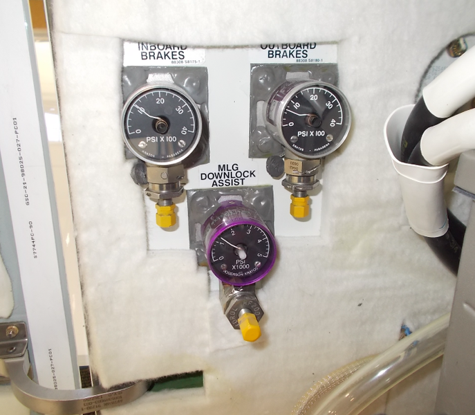 The brake pressure gauge and charge valve is found on the FS635.00 bulkhead in the rear fuselage battery compartment. The gas side of the brake accumulator can be manually pressurized through the charge valve. The gauge shows the nitrogen gas pressure in the accumulator in psi. There are two brake pressure gauges and charge valves. The inboard gauge and valve is for the brake accumulator in the right hydraulic system.
