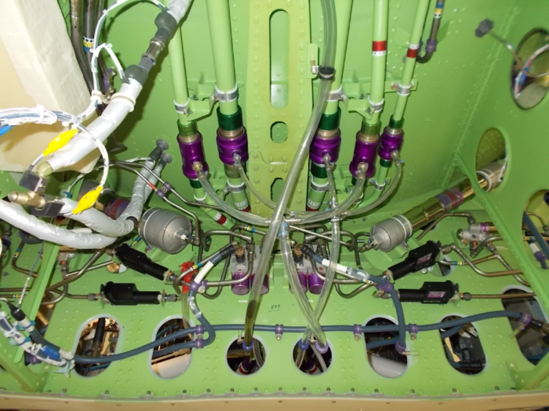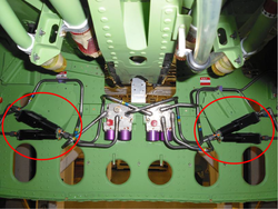 The four brake hydraulic fuses are installed on the aft side of the under-wing fairing support frame. One hydraulic fuse connects to the brake port of each brake control valve, between the brake control-valve outlet and the brake inlet. The hydraulic fuse keeps fluid leakage to a minimum if there is damage to a line downstream of the brake control valve.