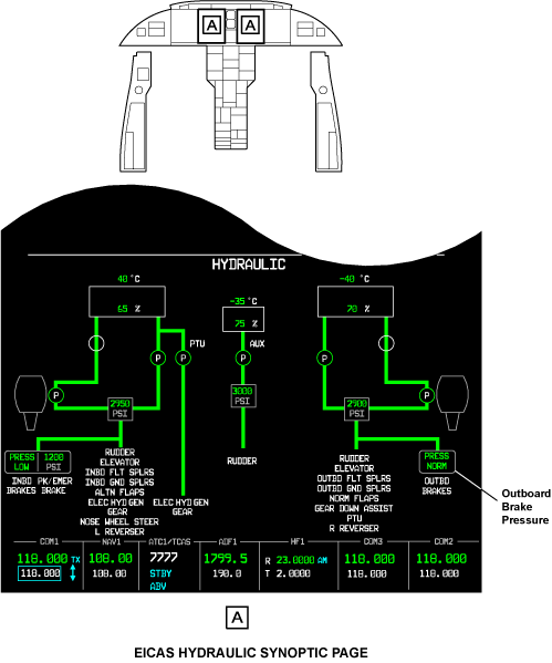 The brake control unit uses pressure switch signals to monitor hydraulic system pressure. The brake pressure switches signals are used to show the status of the brake accumulator (inboard brakes) and emergency/parking brake accumulator (outboard brake) on the EICAS and on the HYDRAULIC synoptic page.
