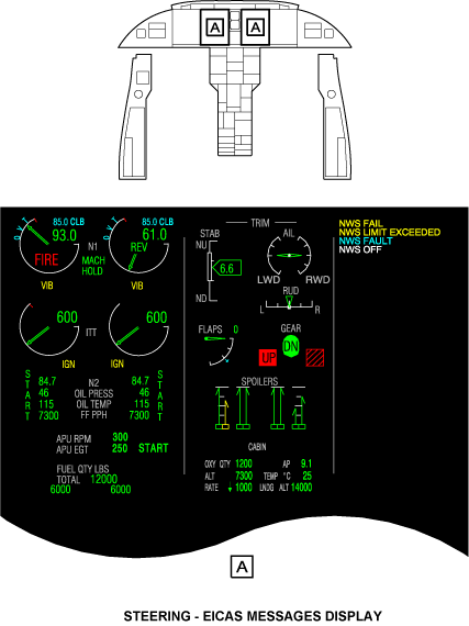 Feedback from the nosewheel is sent back through the steering control unit to the handwheel. The steering system is disarmed when the aircraft is off the ground. The EICAS messages display shown gives the related messages for the steering system.