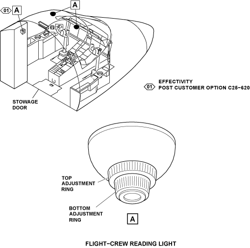 The flight crew reading lights are controlled with an on/off position at the most counterclockwise position on the bottom adjustment ring. The light intensity is then continuously adjustable with the bottom adjustment ring. The dimension of the lighting area is adjustable with the top adjustment ring.