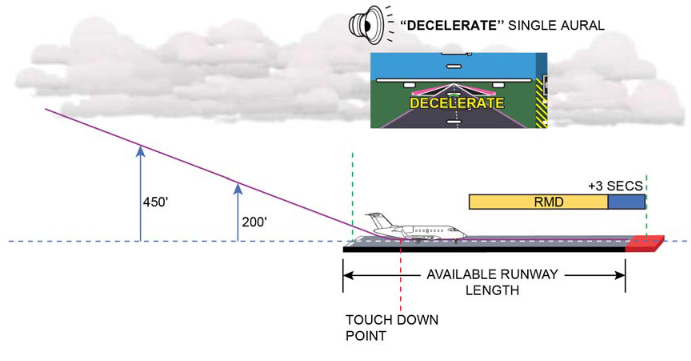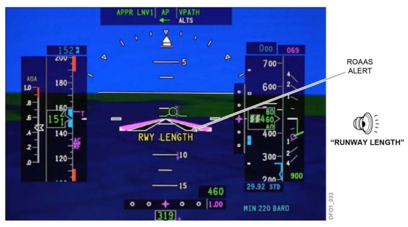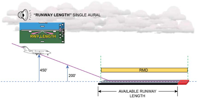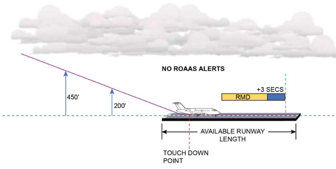 Should the RMD be longer than the remaining available runway length, the ROAAS system will generate the applicable Visual and Aural alerts. There are two levels of In−Air Alerts:
