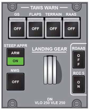 The controls associated with ROAAS are located on the TAWS WARN/Landing Gear control panel.