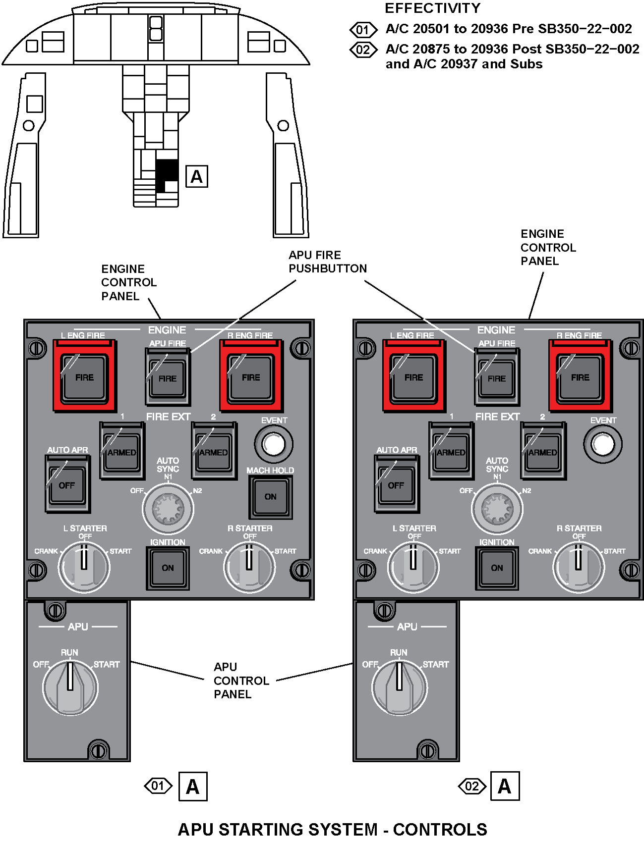 The location of the APU control panel is in the center pedestal, between the pilots' seats. The panel has one three-position switch for the OFF, RUN and START functions. Moving the switch to the OFF position sends a signal to the electronic control unit (ECU) to shut down the APU. The ECU then does a functional check of the overspeed shutdown function. Moving the switch to the RUN position energizes the ECU circuits and starts ECU subsystem and memory tests. This power-up sequence is completed in approximately three seconds. When the tests are done, the ECU starts ARINC 429 communication and goes to idle mode. To make the APU start, the switch must be held in the START position for approximately one second. The starter motor and the ignition system are then energized.