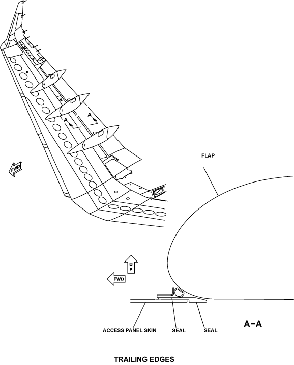 The access panels of the inboard and outboard trailing edge sections have skins that are made of chemically-milled aluminum alloy sheet. On the outboard trailing edge section, two types of seals that are made of silicon rubber are installed aft of each access panel. They touch the leading edge of the flap in its retracted position.