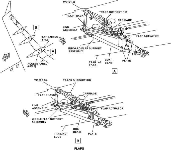 The flap fairings are installed on the flap support assemblies at WS121.50, WS202.75, and WS263.90. The flap fairings decrease drag. They also give protection to the flap support structures. Each fairing is divided into three parts, forward, aft and tail. The forward fairing is attached to the flap support assembly and they do not move. The aft and tail fairings are attached to the forward fairing with the hinges and they move with the flap. The fairing skins are made from Aramid-Fiber Reinforced Plastics (AFRP). The frames and beams are made from clad aluminum-alloy sheets. The hinge fittings are made from machined aluminum alloy. The access panels are installed on the inner and outer sides of each fairing. The access panels are made from clad aluminum-alloy sheets.
