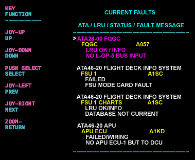 - Using the joystick, select Current Faults (if the fault is active) or Aircraft History to research stored faults. From Aircraft History you can then select Fault Message History and locate the fault. Going into advanced diagnostics will provide an equation id for the fault identified.