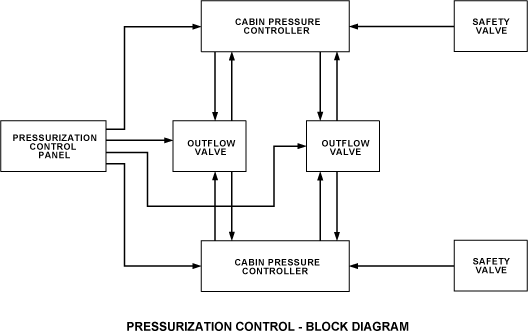 The cabin-pressure control system controls the pressure altitude of the pressurized compartments. The cabin-pressure control system has two modes of operation, automatic mode and manual mode. A safety system overrides the two modes if the pressure becomes too large. There are two cabin pressure controllers, two outflow valves, two safety valves and a PRESSURIZATION control panel.
