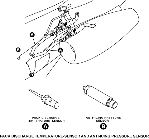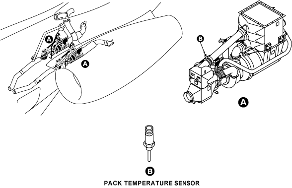 The pack temperature sensor (PTS) measures the temperature of the water extractor outlet. The PTS supplies a temperature measurement signal to the air conditioning system controller. The controller uses the temperature measurement to control the performance of the cooling system, and to prevent ice accumulation in the water extractor. The dual element PTS is installed on the air conditioning unit downstream of the water extractor.