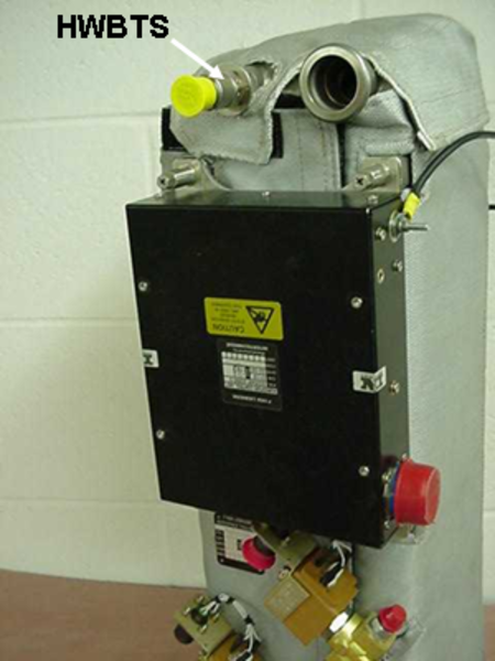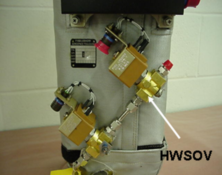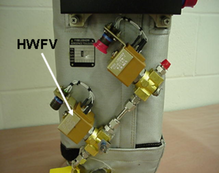 The humidifier water feed valve (HWFV) is in series with the water shutoff valve. It is installed as a safety device if the shutoff valve fails. It is a solenoid valve that is spring-loaded closed and requires 28 VDC from the humidifier control unit to open. It also includes a restrictor at its inlet to limit the incoming water.