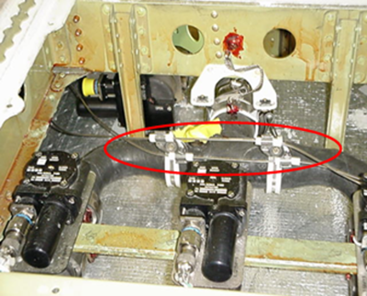 A set of loops goes from the aft pressure bulkhead to the humidifier boiler inlet. Another set of loops is routed along the ECS TAV's inlet duct (fork shape). A wire cable links these two sets of loops.