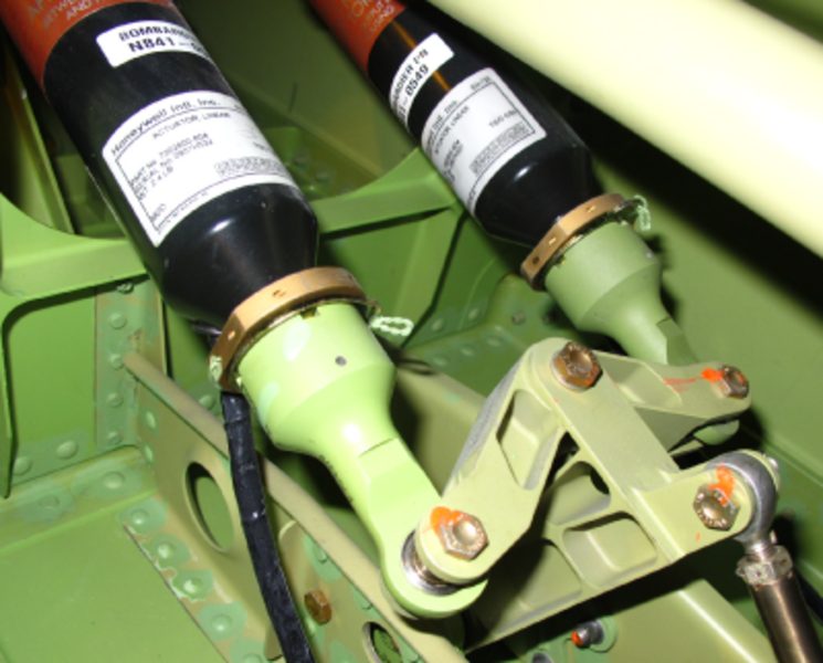 The yaw damper system has two linear actuators that are the same. Automatic control of the aircraft rudder surface is performed via linear actuators. The linear actuators are installed in the vertical stabilizer between the yaw damper pivot assembly and the yaw damper summer. Each actuator weighs 2.4 lbs (1.090 kg). The two separate independent linear actuators are used in series with the aircraft control system, working in conjunction with the YD function. Each actuator is dedicated to one FGC. When the yaw damper is engaged, the active flight guidance computer releases the brake on its linear actuator and the other linear actuator remains braked and is in a standby mode. Either FGC has the ability to center the actuator dedicated to the other FGC, in the event of an FGC failure.