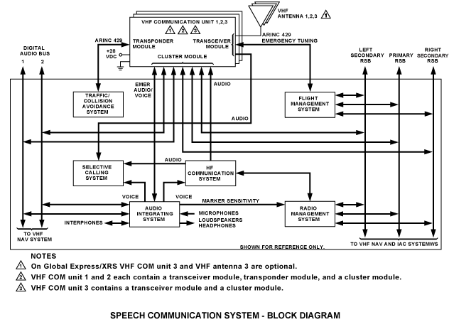 The VHF COM system is a remote-controlled integrated COM radio system. The VHF COM unit 1 and VHF COM unit 2 transmit and receive voice/data on 2,278 channels between 118.000 and 136.975 MHz.