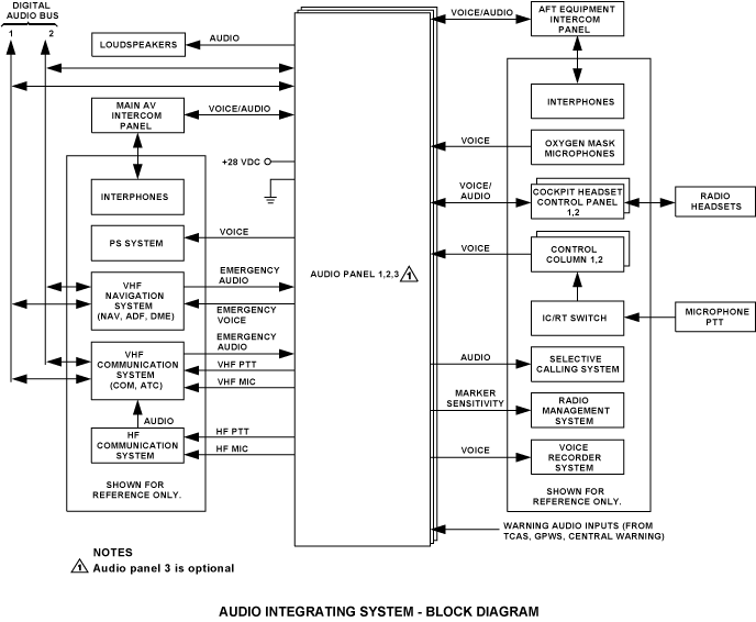 The audio integrating system gives a high level of failure protection. If one of the two buses fails, the system can supply the pilots with emergency COM and NAV communications through the good bus. If the two buses fail completely, the system can supply the pilots with emergency COM and NAV communications through the analog audio buses.