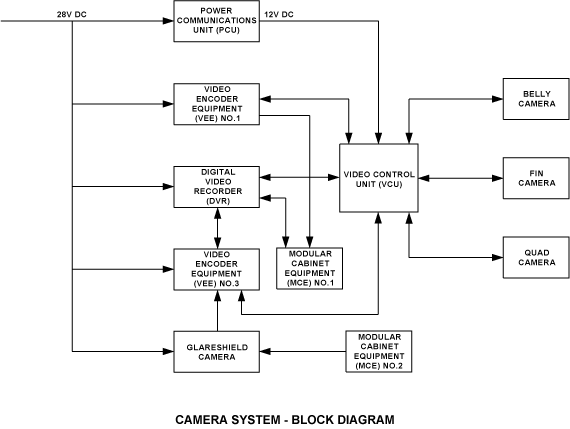 The camera system is an added feature to the security system. The camera system is comprised of many cameras. Any combination of cameras could be installed based on the customer request. The camera system is controlled by a video control unit (VCU). All cameras provide analog type video signals to VCU which manages video outputs as given by CES / security system control. All cameras video images are selectable video sources that can be displayed on cabin monitors and on cockpit multi function displays (MFD).