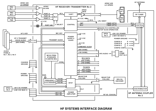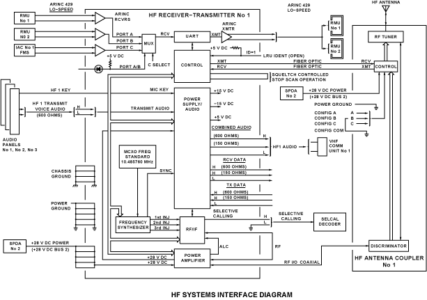 Power for the system comes from two secondary power distribution assemblies (SPDA). SPDA 2 feeds HF 1 receiver/transmitter through one 15 A 28 VDC BUS 2 solid-state power controllers (SSPC). It also feeds the antenna coupler through one 5 A 28 VDC BUS 2 SSPC. HF system 2 is similar to HF 1, with the source from SPDA 3, 28 VDC BUS 1.