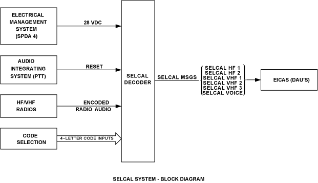 The output of the three VHF and two HF receivers, audio containing the SELCAL code, is sent to the decoder. When the decoder detects the aircraft code, a discrete (ground) output is sent to DAU 3 or DAU 4. The DAUs convert the input to an ASCB format and forward it to the integrated avionics computers. The fault warning computers process this input, send a CAS "SELCAL HF 1, 2, VHF 1, 2, 3" to the EICAS indicator and an aural message "SELCAL, SELCAL" to the audio integrating system. The CAS message is reset by a momentary transmission on the selected communication system. The reset signal is a ground output from the audio panels.