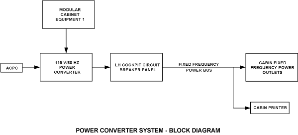 The power converter system adds 115 VAC, 60 Hz to the electrical power distribution for the operation of optional cabin equipment. The power converter system provides suitable power for the cabin equipment that cannot be connected to the aircraft electrical power and to the electrical outlets installed in the cabin and the cockpit for the use by crew or the passengers with portable electrical devices.
