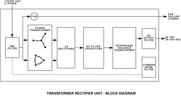 The AC power inputs and the fan malfunction output connect through a multiple-pin connector on the front of the TRU. The DC power output connects through a pair of terminals on the front of the TRU. The AC-to-DC conversion is done by a multi-phase power transformer and 24 rectifiers. The output current is regulated by DC filter capacitors and an interphase balance transformer.