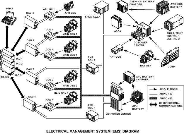 The EMS CDU is the hub of all communications between the electrical system power distribution components, integrated avionics computers (IACs) and the DAUs. It acts as a gateway to route all information between the DAUs and the powerdistribution assemblies, i.e. ACPC, DCPC, and SPDAs. A single EMS CDU is sufficient to handle all the communications for the electrical system. However, the two EMS CDUs are required to get the complete electrical system status and operation.