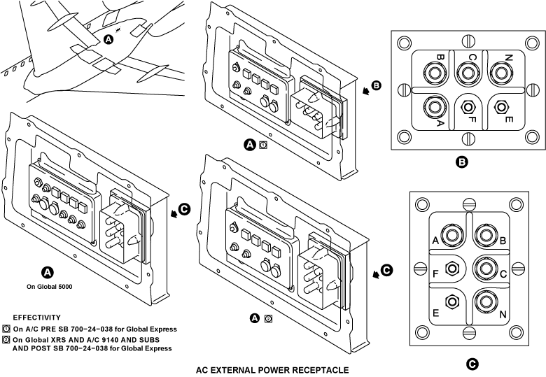 The AC external-power receptacle is installed in the lower rear fuselage on the left side of the aircraft. It has six pins for the connection to the external ground power unit and six terminals for the connection of the aircraft leads. The pins and terminals have covers for protection.