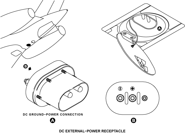 External DC power is connected to the aircraft through an external power receptacle installed in the rear equipment compartment. This 28 VDC external power supply can start the APU and supply DC power for the battery bus and the DC ground-service mode.