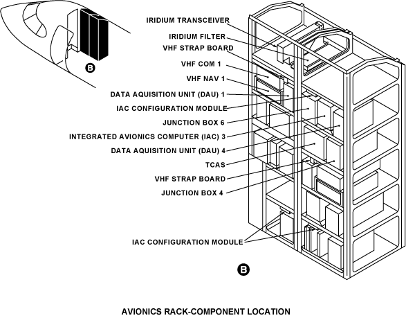 The layout of the LRUs within the avionics rack is such that redundant system units are not placed in close proximity to each other. Adequate space between units is provided to allow for maintenance accessibility, modifications and troubleshooting. The complete rack structure is attached to the top support intercostals, utilizing slotted holes to avoid fuselage pressurization loads. This top support is used to react fore/aft loads.