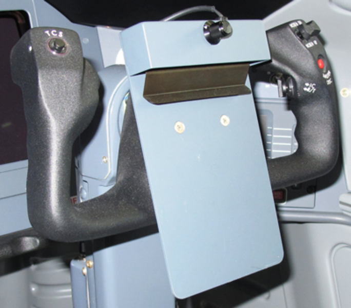 The chart holder is a clip type bracket attached to the pilot’s and the copilot’s control wheel. The chart holder attaches documents in position for the flight crew. It also holds aviation charts in position to help the flight crew with navigation and has LED lights to illuminate the charts. There is a control knob to control the LED lights' brightness.