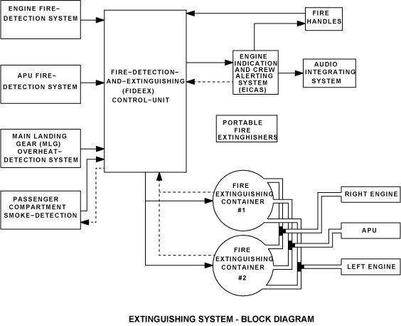 The extinguishing system supplies the fire extinguishing chemicals to the engines or the auxiliary power unit (APU) through a distribution system controlled in the flight compartment.