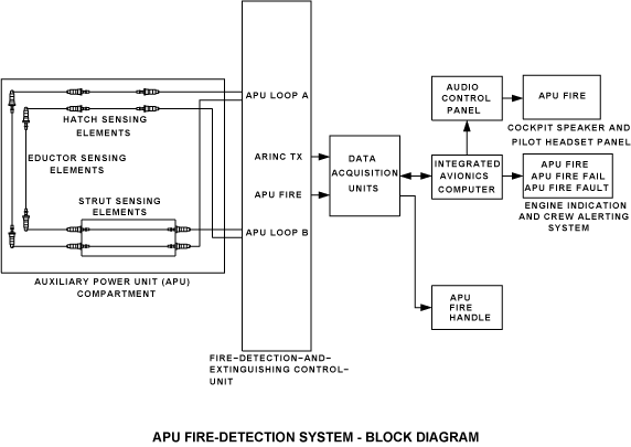 The APU fire detection system is very similar to those of the engines. The APU also has two independent loops, Loop A and Loop B, like those on the engines. Each loop has three detectors connected in a series circuit. In order for the FIDEEX control unit to trigger the APU fire warnings, both the loops must sense a fire condition. Similar to the engine, the APU fire warning is also protected against false warnings due to shorts/opens.