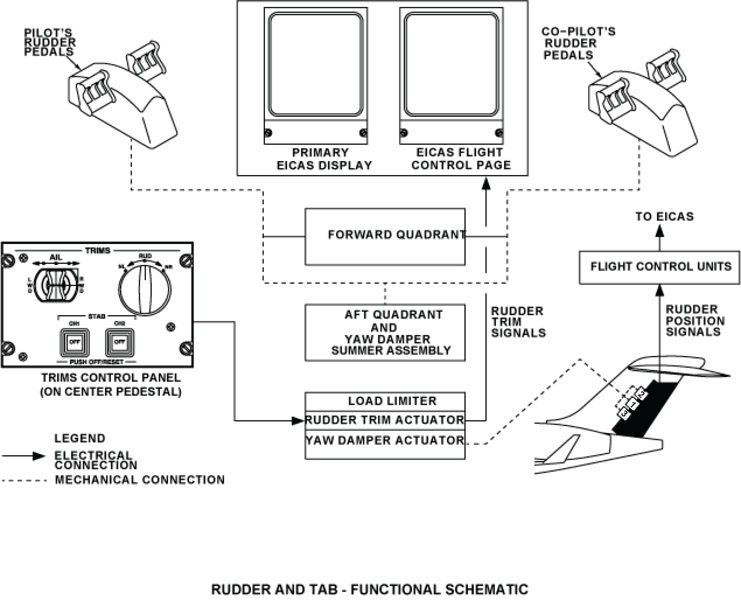 A rudder trim switch (RUD TRIM) installed on the center pedestal gives rudder trim. The automatic flight control system also gives rudder control. The position indication for the rudder shows on the EICAS.