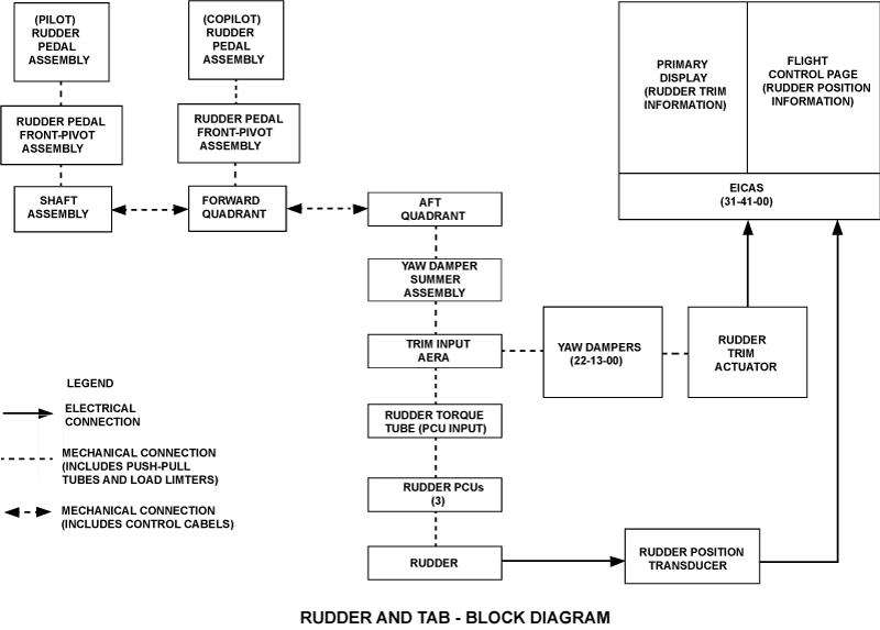 The pilot and copilot rudder pedals give rudder control through a series of cables, pulleys and mechanical linkages. Three independently operated power control units (PCUs) move the rudder control surface. The PCUs are mechanically controlled and hydraulically operated.