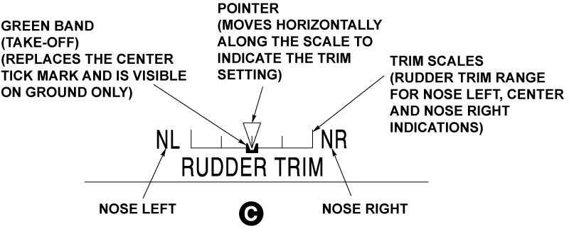 The EICAS primary page shows the rudder trim position along with the permitted take-off range which is shown as a green band. The green band is equivalent to -7.4% and +7.4% of the full trim scale. The trim pointer is green when it is in the green band range. When the pointer goes out of the green band, it turns into white. If the rudder trim is at -11.1% and +11.1% or more on the trim scale when the throttles move forward during the take-off roll, then the EICAS display shows a "CONFIG RUD TRIM" red warning message along with a “NO TAKE-OFF” aural warning.