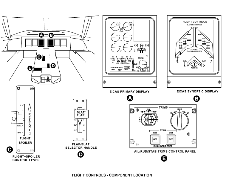 The engine indication and crew alerting system (EICAS) shows flight control position and warning signals. The primary flight control surfaces are designed for fail safe operation and have anti-jam properties to keep flight control input. To let the pilot feel aerodynamic loads, artificial feel and centering units are included into each primary flight-control system.