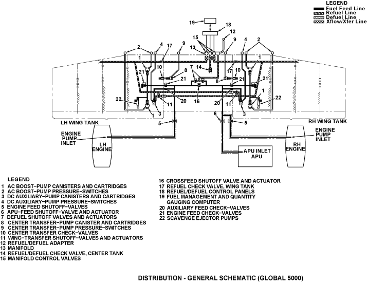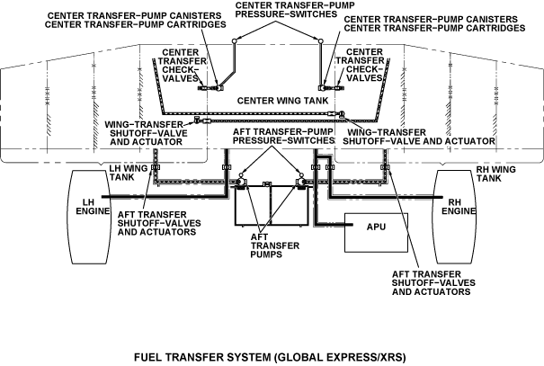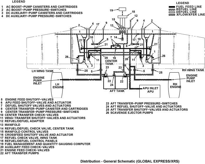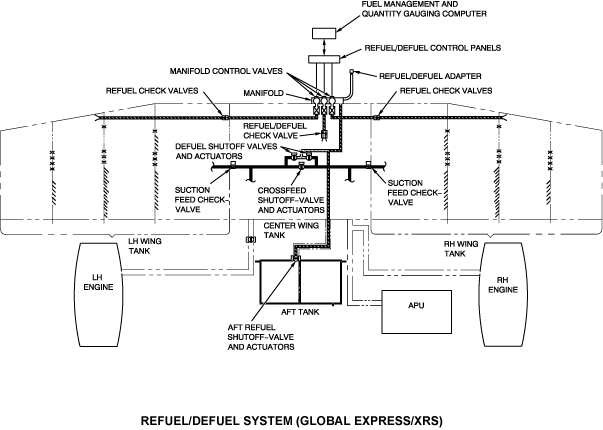 The distribution system controls the movement of fuel to the wing tanks, center tank, aft tank (on Global Express/XRS only), engines, and auxiliary power unit (APU). The distribution system supplies the flow of fuel for the fuel feed, the fuel transfer, and the refuel/defuel of the aircraft.