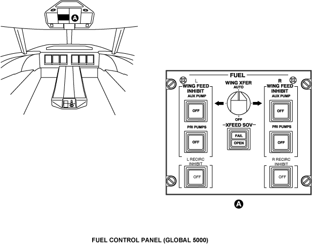 On Global 5000, the FMQGC controls the thermal management system automatically. The L and R RECIRC OFF push button annunciators (PBAs) on the FUEL control panel permit the flight crew to prevent the FMQGC from opening the FRTT valves.