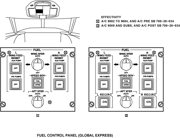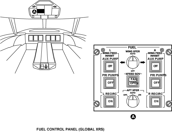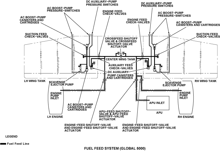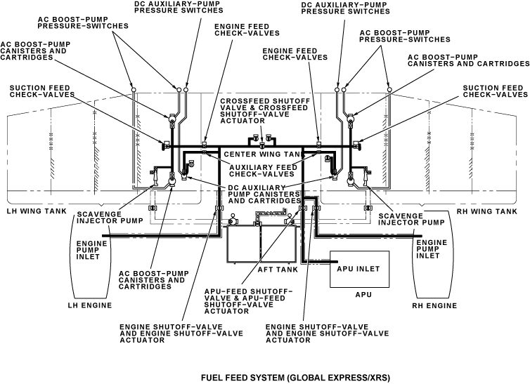 The fuel feed system supplies fuel to the engines and the APU from the wing tanks. The center tank and the aft tank (only on Global Express/XRS) supplies fuel to the wing tanks. There is also a crossfeed system that will supply fuel to each engine from each wing tank. The FUEL control panel controls all pumps and valves. The fire handles control the engine-feed shutoff valves and the APU shutoff valve. The APU full-authority digital engine-controller (FADEC) also controls the APU shutoff valve.