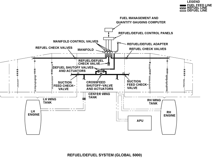 The distribution system includes the fuel feed, fuel transfer, refuel/defuel, thermal management, scavenge, and the fuel management and quantity gauging system. The fuel feed supplies fuel to the engines and to the APU. The fuel feed also supplies the crossfeed system for the tanks. The fuel transfer system moves fuel from the center tank or aft tank (only on Global Express/XRS) to the wing tanks. The transfer system also balances the lateral weight of the aircraft. The refuel/defuel system can only engage on the ground. The fuel management and quantity gauging system controls and monitors the operation and flow of the fuel system.