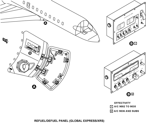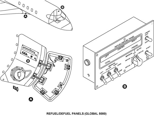 The REFUEL/DEFUEL control panel controls the manual defuel mode when the switch is in the DEFUEL position. On Global 5000, three MANUAL switches, one for each tank, control the defuel operation in the manual mode and on Global Express/XRS, four MANUAL switches, one for each tank, control the defuel operation in the manual mode.The refuel/defuel control panel will give you a display of the fuel quantity while you defuel each tank.