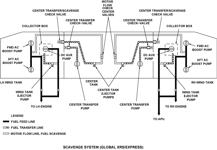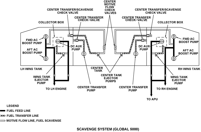 The wing-tank scavenge system scavenges and transfers fuel from the wing tanks to collector boxes that surround the DC auxiliary pumps. Pressure from the DC auxiliary pumps supply motive flow to the wing-tank ejector pumps. The wing-tank ejector pumps scavenge and transfer fuel into collector boxes that surround the DC auxiliary pumps.